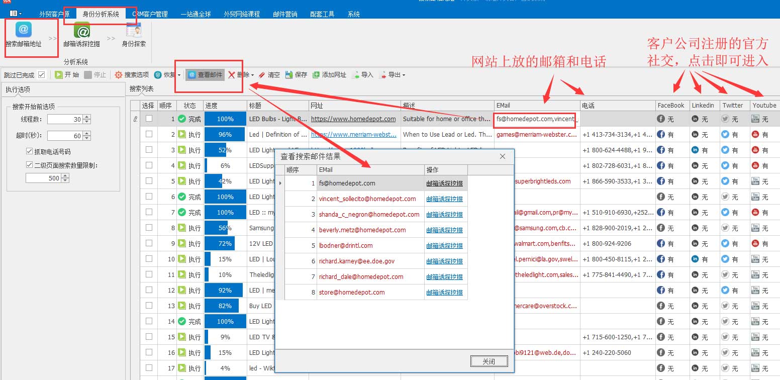 二、功能作用:通过网址可自动搜索网站上的邮箱、电话号码及官方社交