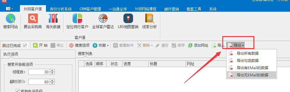 导出可以选择导出所有数据、导出勾选数据、导出有email数据和导出无email数据